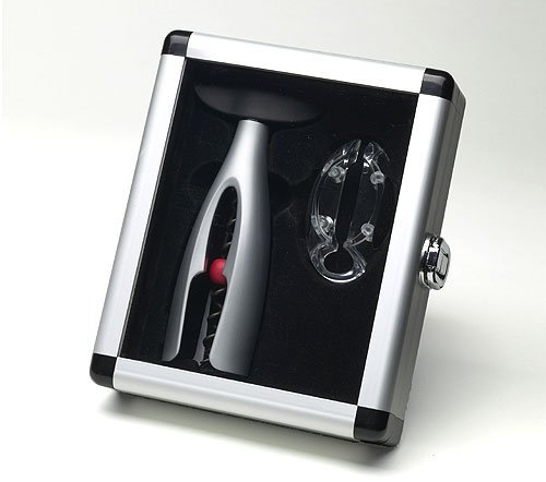Screwpull Satin Trilogy Table Model and Clear Trilogy Foilcutter Gift Set. Integrates double-helix self-pulling technology; removes cork from the bottle effortlessly.